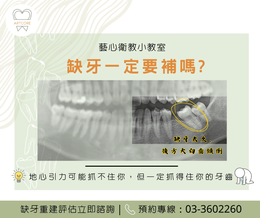 藝心小提醒:記得定期回診檢查,確保缺牙帶來的影響是否需要處理,並透過日常正確清潔,以及定期洗牙,維持口腔#專科團隊